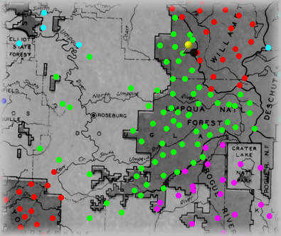 The Yellow "pin" signifies where this site is within the forest. Click on Green dots above to visit other sites in this forest. Click on other colors for sites in adjacent forests. |